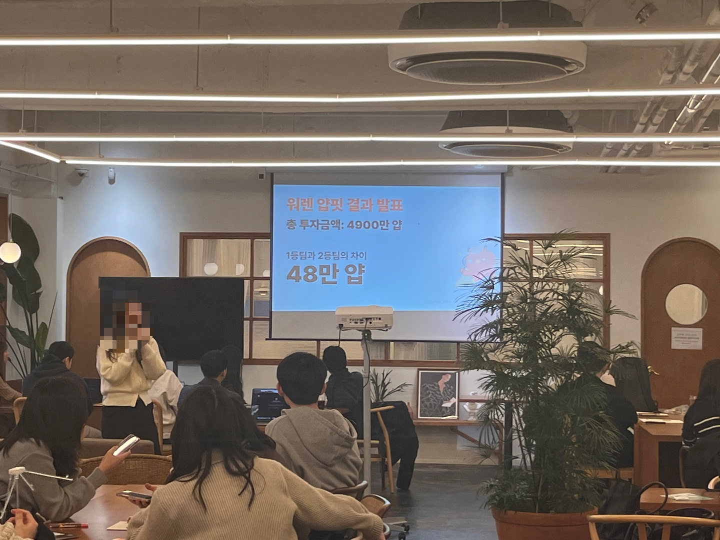 이번 성과공유회에서는 나에게 100만 얍이 있다고 가정했을 때, 투자금을 배분해서 가장 많은 투자금을 받은 팀을 우수팀으로 선정했는데요! 저희 여비가 우수팀으로 2위를 해서 너무너무 뿌듯했습니다.. 정말 기대 안 하고 있었는데..! ㅜㅜ 모두 우리 팀원분 덕분이죠.. 💗 💗